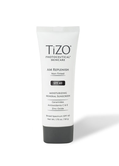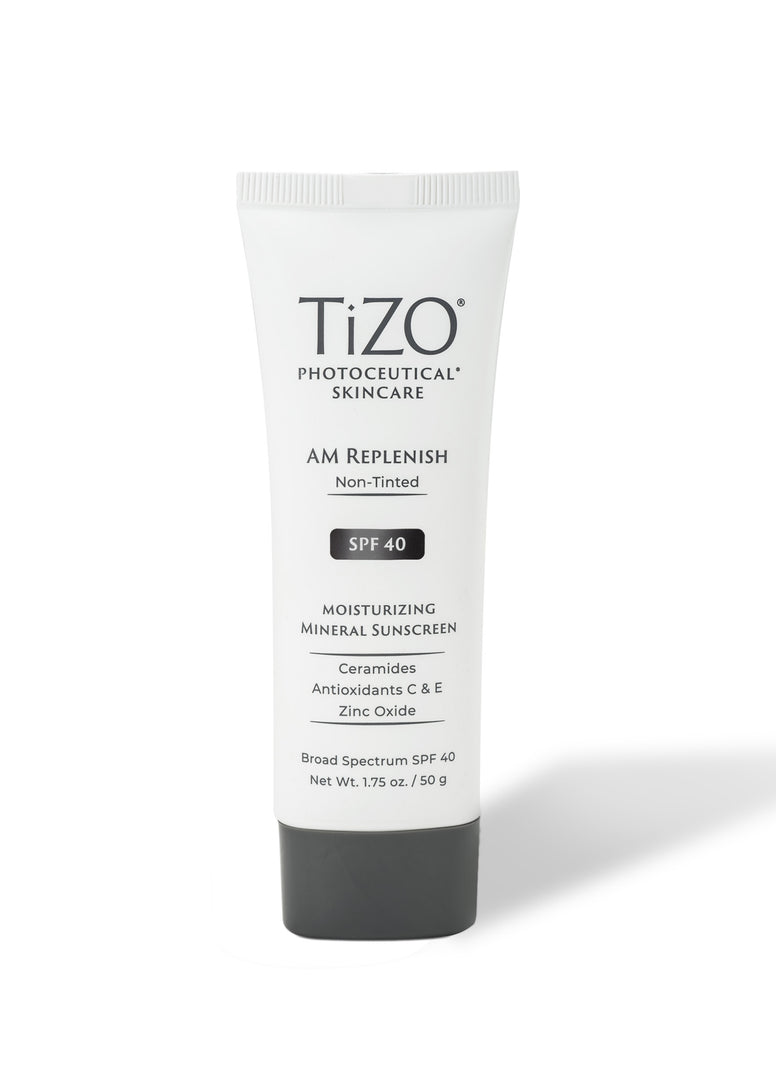 TIZO® AM Replenish Non-Tinted SPF 40 is formulated with Zinc Oxide, Ceramides, and powerful Antioxidants (Vitamins C and E). Zinc Oxide protects against UV damage and Ceramides help restore the lipid layer. TIZO® AM Replenish helps prevent future UV damage and aids in the repair of existing damage resulting in long lasting moisturization.
