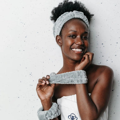 Circadia Plush Headband & Wristbands are a professional-grade skincare accessory set designed to make facials and home skincare routines easier and more hygienic. Made from ultra-soft, absorbent materials, the headband keeps hair away from the face while the wristbands protect clothing and prevent product transfer.
